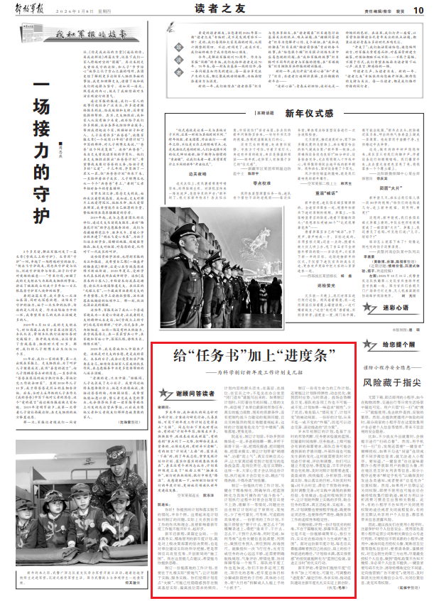 新年伊始,希望你们能给年度“任务书”加上可视化、可量化、可调整的“进度条”,锚定目标、务求实效,推动连队建设在新年度扎扎实实迈上新台阶。