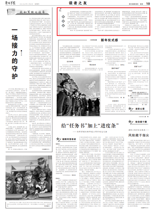 新的一年,我们继续在“读者推荐”栏目与您共享好文,在“读者圆桌”栏目邀您讨论基层关注的热点、难点话题,在“谢顾问答读者”栏目为您解开心结、支个好招,在“我和我的勋表”栏目呈现“胸前荣誉墙”背后的奋斗故事,在“给您提个醒”栏目提示训练生活中容易忽视的问题,在“我和军报的故事”栏目聆听不同年代读者与军报的情缘,在“军媒视窗”栏目撷取军兵种报的精彩报道。