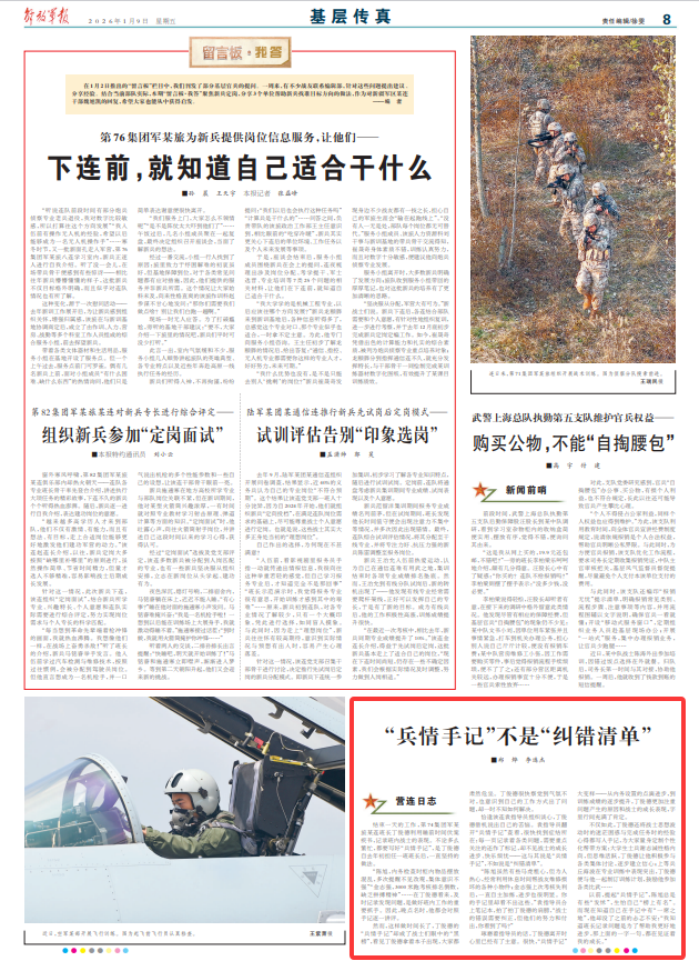 琢磨着指导员的话,丁俊德离开时心里已经有了主意。很快,“兵情手记”大变样——从内务设置的点滴进步,到训练成绩的逐步提升,丁俊德更加注重问题产生的原因和战士的成长表现,字里行间充满了肯定。