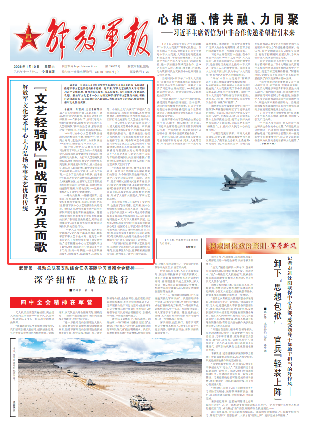 编者按习近平文化思想是繁荣发展强军文化的根本指南,为新时代推进军事文艺建设提供根本遵循。近年来,军队文艺战线深入学习贯彻习近平文化思想,努力为强军服务、为基层服务、为官兵服务,受到部队欢迎。解放军文化艺术中心大力恢复和弘扬军事文艺优良传统,积极打造向战而行、为兵而歌的文艺轻骑队,为推进军事文艺建设、繁荣发展强军文化作出贡献。