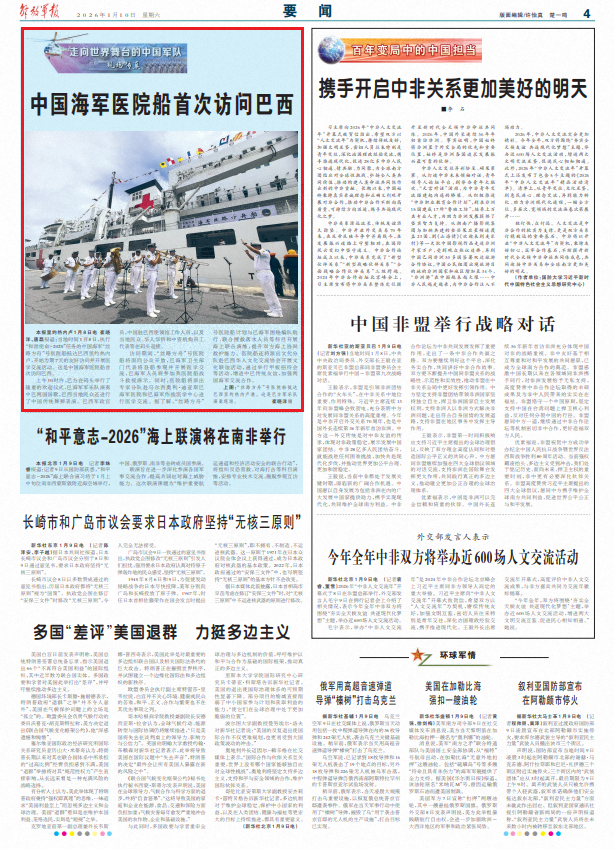 解放军报里约热内卢1月8日电 崔晓洋、唐磊报道:当地时间1月8日,执行“和谐使命-2025”任务的中国海军“丝路方舟”号医院船抵达巴西里约热内卢,开始为期7天的友好访问并开展医学交流活动。这是中国海军医院船首次访问巴西。