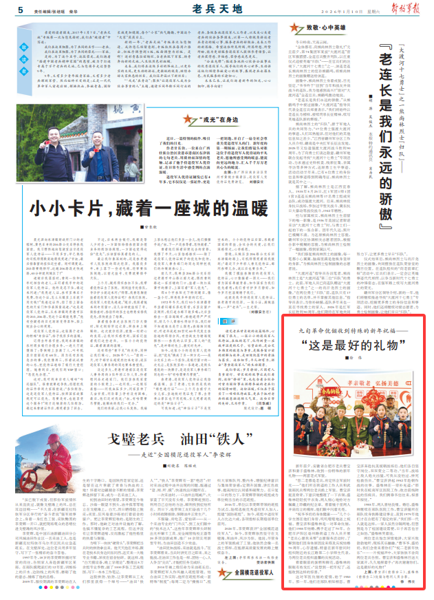 “您二老都是老兵,肯定怀念军旅时光……”他们所在街道的工作人员和武装部民兵帮两位老兵换上军装。曹宝济挺直脊背,下意识地整理了一下衣领,盛维林轻轻抚平衣角,两人细心地给对方佩戴上珍藏的纪念章。看着镜子里两人并肩而立的模样,他们眼中闪着光亮。