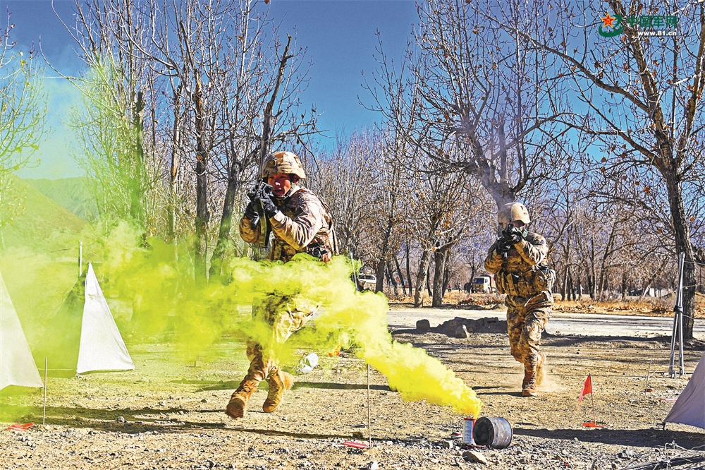 西藏日喀则军分区官兵在海拔4000多米的演训场进行多课目连贯考核。王 乾摄