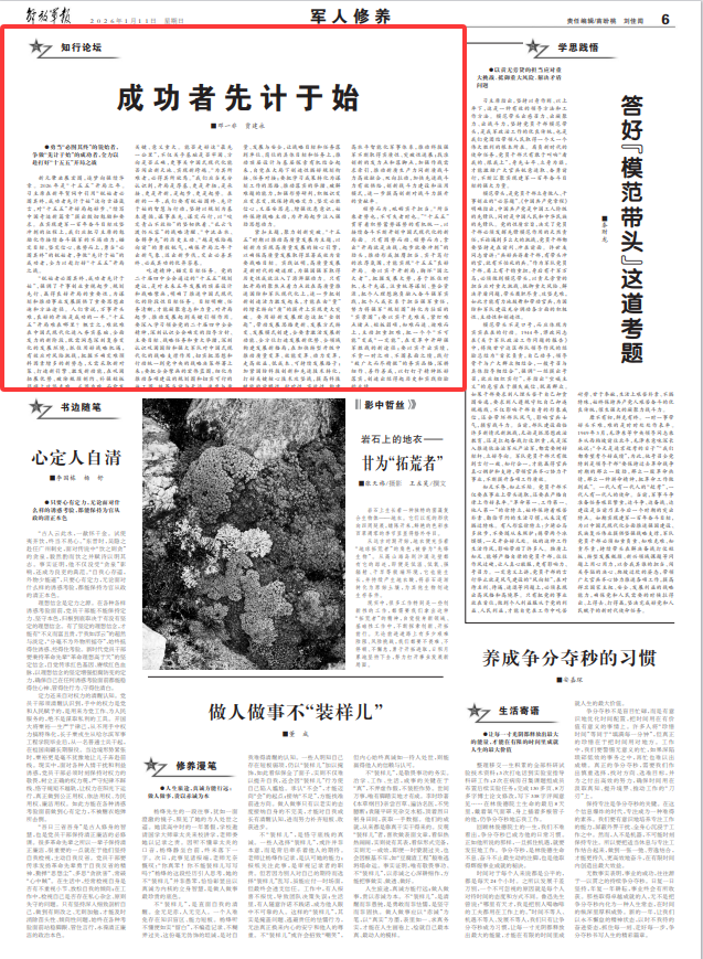 新元肇启展宏图,逐梦向强续华章。2026年是“十五五”开局之年。习主席在新年贺词中引用“锐始者必图其终,成功者先计于始”这句古语箴言,对“十五五”开好局起好步、“续写中国奇迹新篇章”提出殷切勉励和要求。在实现建军一百年奋斗目标攻坚冲刺的征程上,我们应把习主席的勉励化作接续奋斗强军的不竭动力,锚定目标、坚定信心、乘势而上,勇当“必图其终”的锐始者,争做“先计于始”的成功者,全力以赴打好“十五五”开局之战。