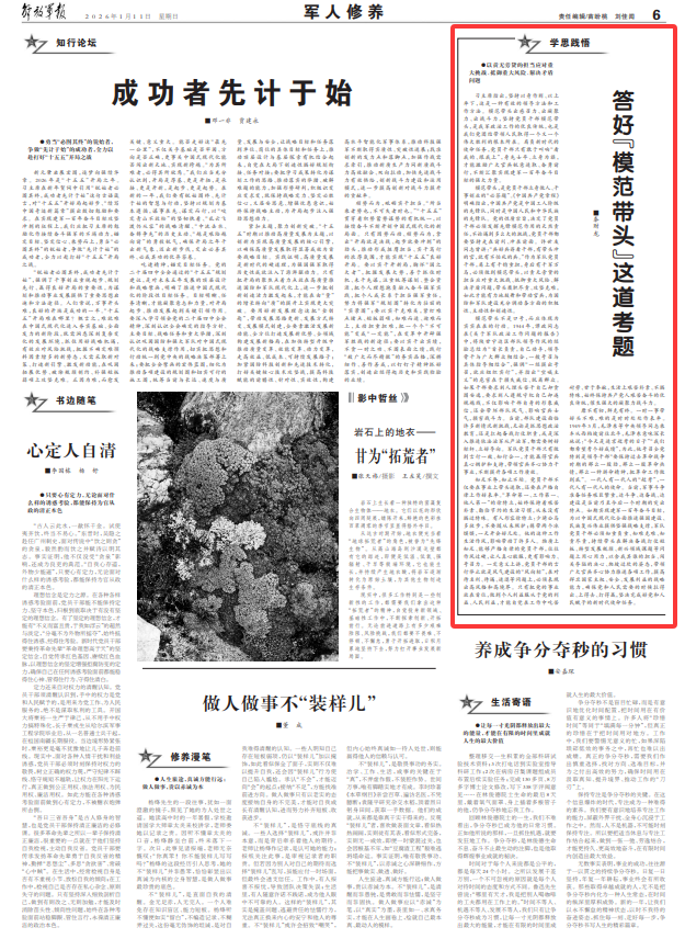 模范带头不是口号,而应体现为实实在在的行动。1944年,谭政同志在《关于军队政治工作问题的报告》中,将陕甘宁边区部队领导作风的经验总结为“首长负责,自己动手,领导骨干与广大群众相结合,一般号召与具体指导相结合”,强调“一经提出号召,就应组织实行”,并指出“空喊主义”的危害在于损失威信、脱离群众。如果干部要求别人埋头苦干自己却贪图安逸,要求别人遵规守纪自己却违规越线,不仅影响干部自身的形象威信,还会带坏部队风气、影响官兵士气,损害战斗力。当前,部队建设面临许多新情况新挑战,无论是抓思想政治教育,还是扛起备战打仗职责,或是深入推进依法治军从严治军,都需要树好标杆、立好导向。军队党员干部只有做到言行一致、知行合一,才能赢得官兵真心拥护和支持,带领官兵齐心协力干事业,不断提升各项工作质效。