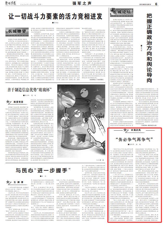 “辞家千里”,是无悔的选择;“务必争气”,是坚定的承诺。懂得争气、努力争气的军人,血是炽热的,心是澎湃的,状态是昂扬的。“兵之所恃者,气也。”越是在遭受挫折的时候,越需要争气;越是在攻坚克难的时候,越需要争气。
