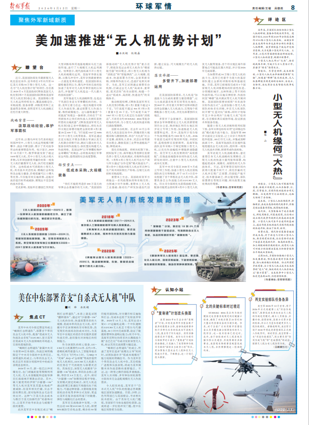 多管齐下全面铺开。美国国防部要求各军种都要设立无人机资源管理项目办公室,欧洲地区和印太地区同步设立专项工作组,加速推进无人机部署和运用。其中,美陆军计划为每个作战师配备约1000架无人机,2026年底前完成所有现役师列装,并授权营、连级指挥官直接调用。美海军陆战队宣布采购1万架定制版小型无人机,以优化作战编组并增强渗透隐蔽性。美空军无人机发展转向“高低搭配”,在推进高端隐身协同作战无人机研发的同时,注重中小型无人机的低成本化发展。