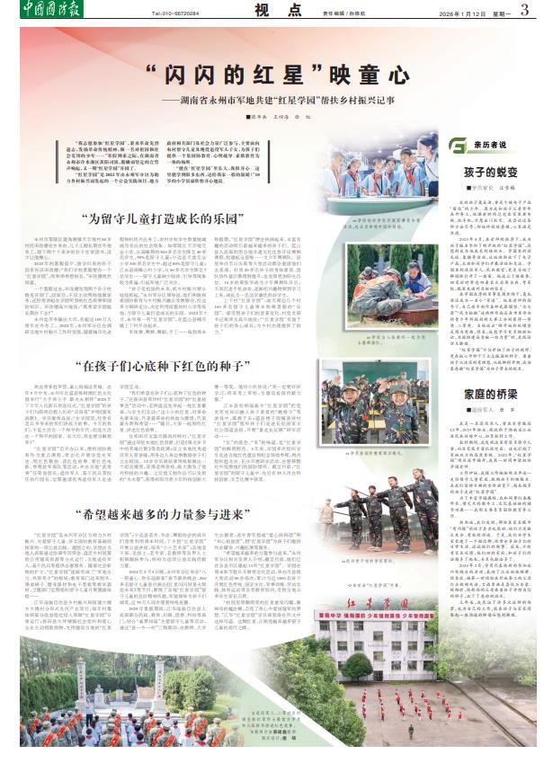 “希望越来越多的力量参与进来。”永州军分区相关负责人介绍,截至目前,他们已在各县市区建起13所“红星学园”。学园在周末和节假日开展常态化活动,举办市县级大型活动50余场次,累计为近1800名孩子开展红色传统、国学文化、军事训练、劳动实践、体育运动等各类教育培训,受到当地众多学生家长点赞。
