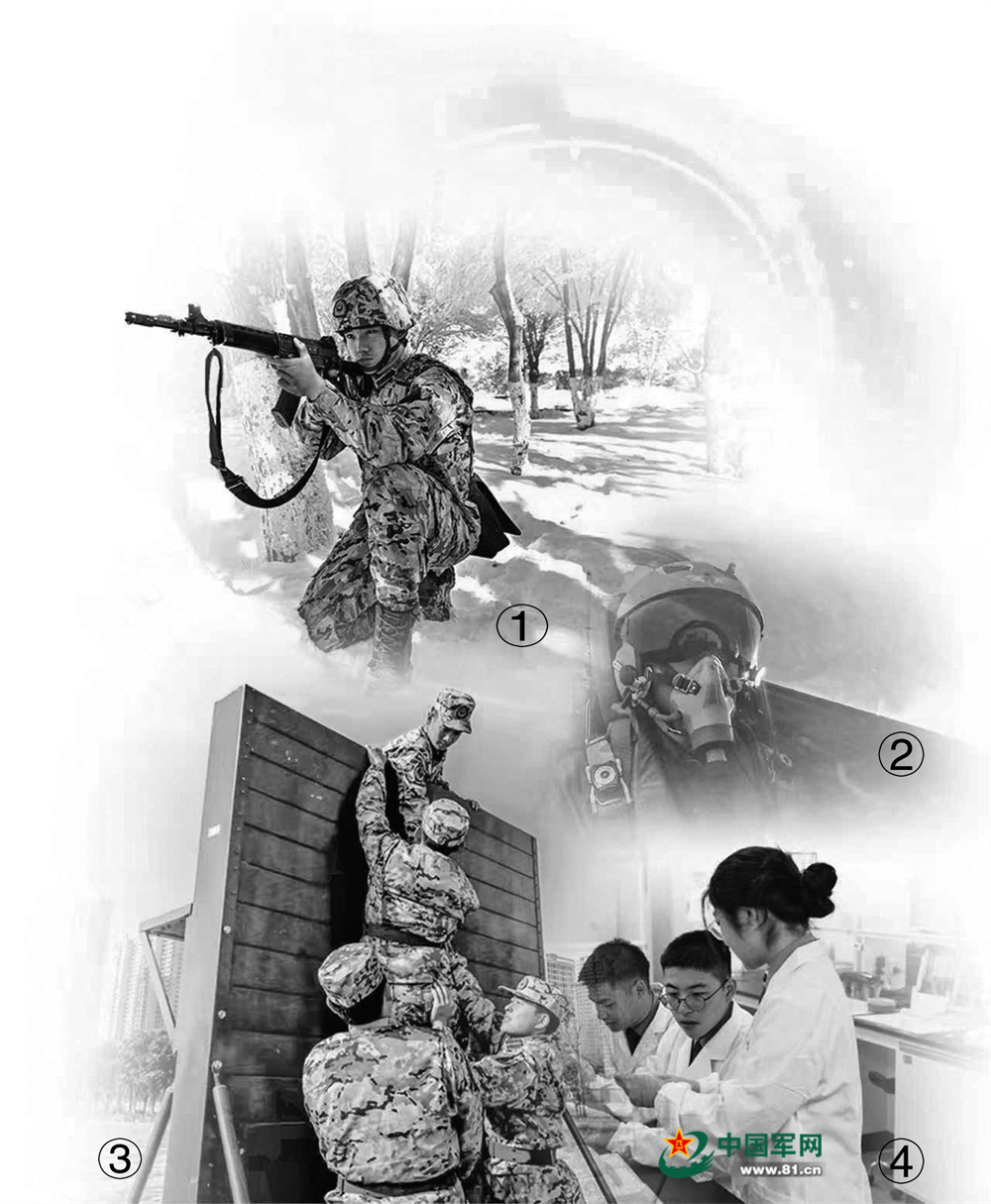 图①:冬季训练;图②:飞行训练;图③:攀爬训练;图④:科研实验。唐明杰、晏 涛、韩伟业、李士成摄