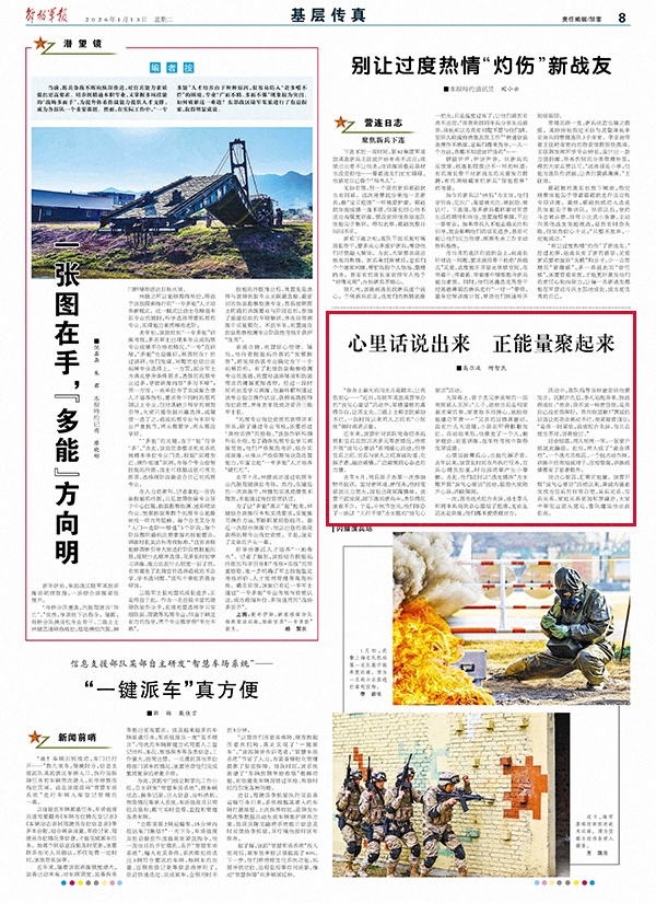 心里话鼓舞兵心,也能化解矛盾。去年以来,该营长时间在外执行任务,官兵心理负担重,时而因琐事产生小摩擦。为此,他们适时以“战友情深”为主题开展“说句心里话”活动,鼓励大家敞开心扉,消除隔阂。