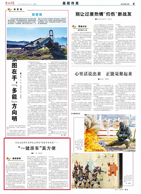 据了解,该部“智慧车场系统”投入使用后,派车效率较以前提高了80%。下一步,他们将持续优化系统功能,拓展导航定位、远程监控等应用场景,推动“智慧保障”向多领域延伸。