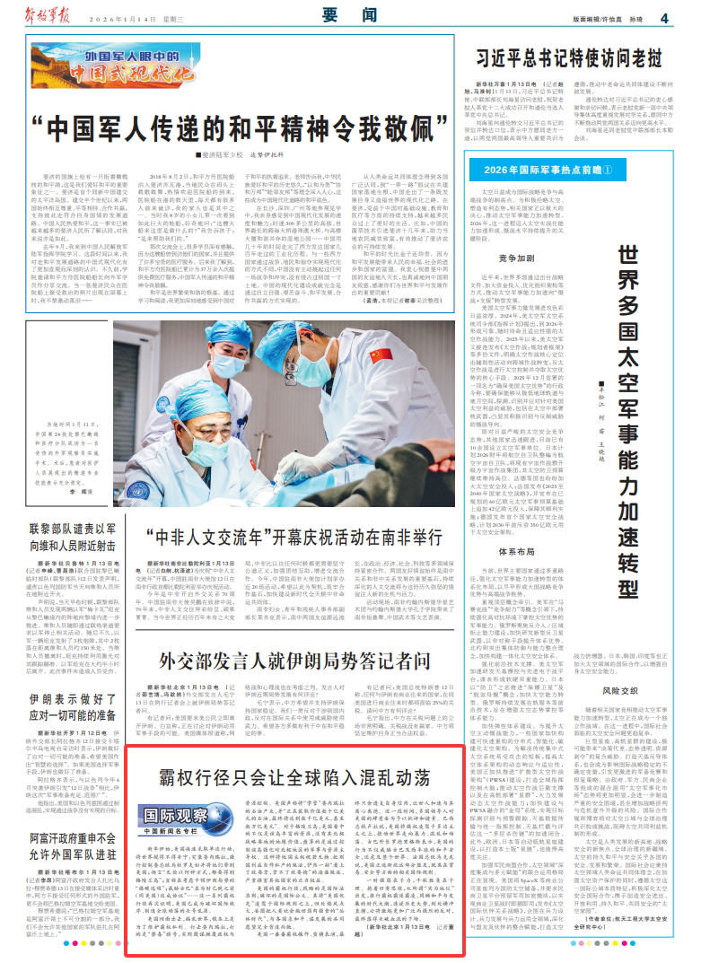 新年伊始,美国接连采取单边行动,将世界搅得不得安宁:突袭委内瑞拉,强行控制委总统马杜罗夫妇并将他们带到美国;扬言“无论以何种方式,都要得到格陵兰岛”;宣称在考虑干预伊朗局势的“强硬选项”;威胁古巴“在为时已晚之前(同美国)达成协议”……这一系列霸权行径再次证明,美国已成为破坏国际秩序、制造全球动荡的头号乱源。