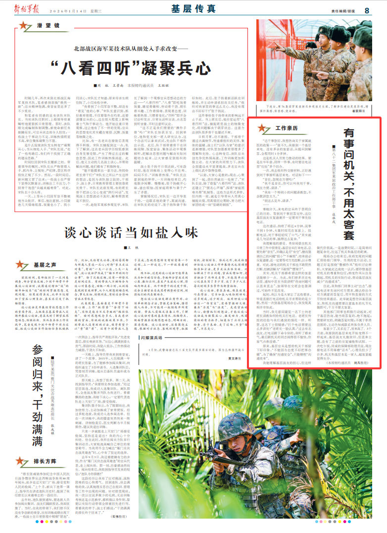 客套少了,关系近了,效率高了。3个月前,我接到的基层来电开始变得不一样起来,基层战友礼貌依旧,但直奔主题,没有了之前的反复铺垫和试探。一次吃午饭,同桌的保障部助理员说,现在接电话不用琢磨“话术”,心理负担少了许多,机关和基层本是一家人,越客套越显得生分。