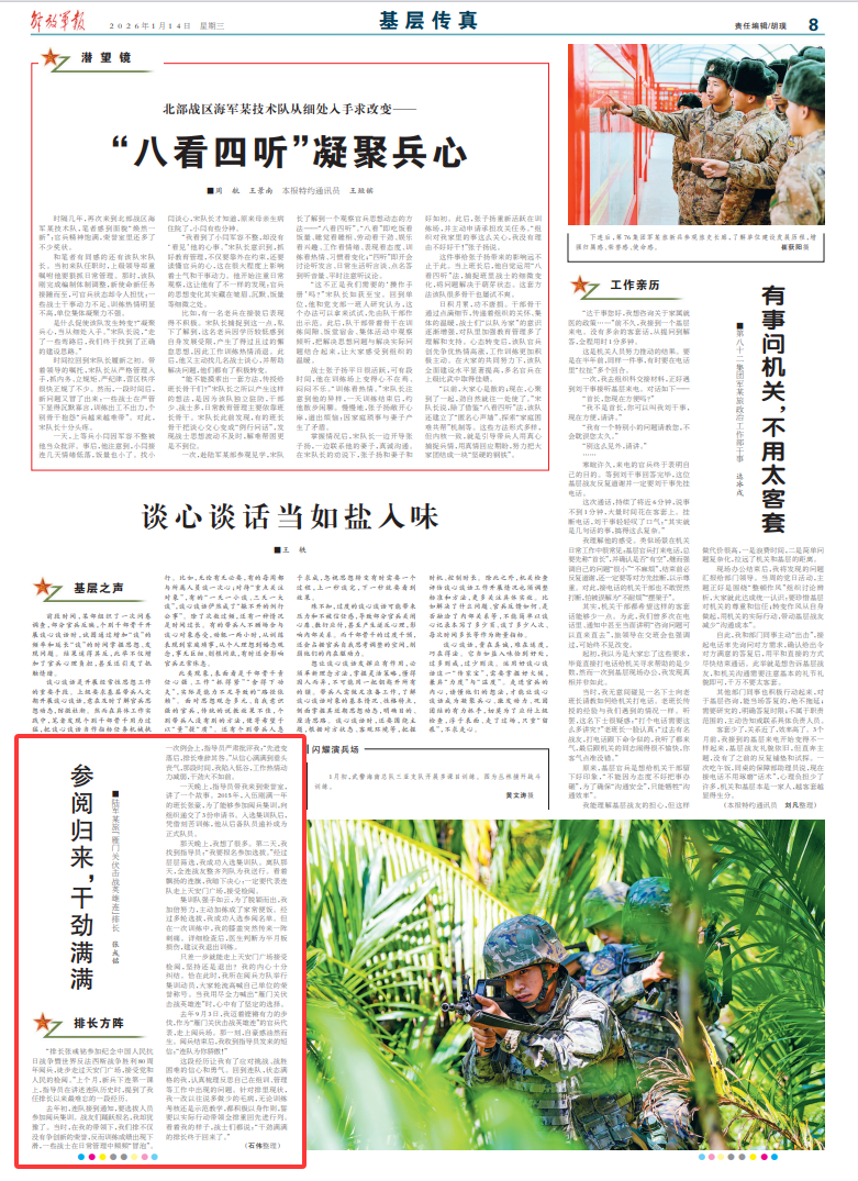 这段经历让我有了应对挑战、战胜困难的信心和勇气。回到连队,状态满格的我,认真梳理反思自己在组训、管理等工作中出现的问题。针对排里现状,我一改以往说多做少的毛病,无论训练考核还是示范教学,都积极以身作则,誓要以实际行动带领全排重回先进行列。看着我的样子,战士们都说:“干劲满满的排长终于回来了。”