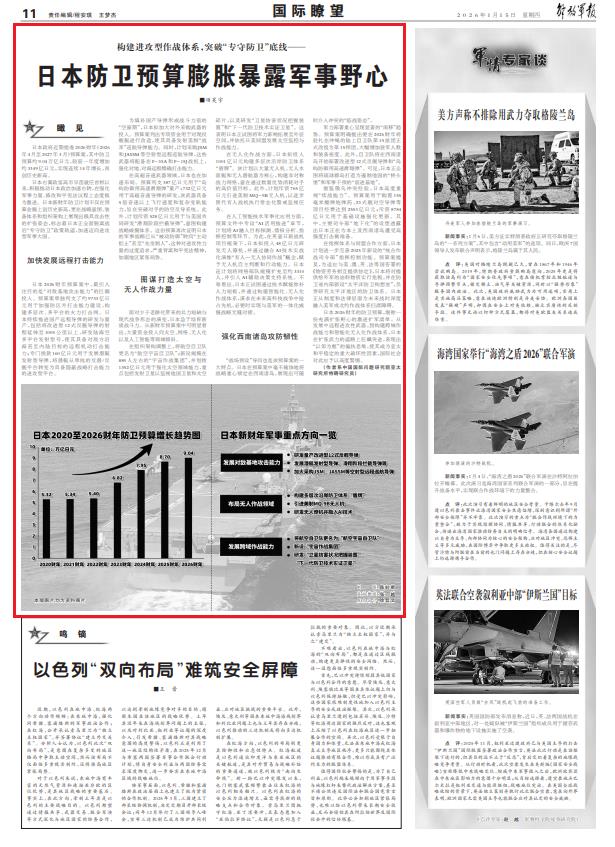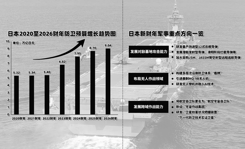 日本2026财年的防卫预算,堪称一份充满扩张野心的激进扩军清单。从发展中远程进攻性武器,到构建跨域作战能力和智能化无人化作战体系,日本在扩张武力的道路上狂飙突进,表现出“以邻为壑”的偏执思维,使其成为亚太和平稳定的重大破坏性因素,国际社会对此应予以高度警惕。
