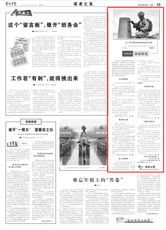 去年年末,很多媒体和机构推出年度热词榜单,“情绪价值”这个网络高频词脱颖而出,折射出人们对情感关怀、心理慰藉和精神共鸣的向往,对被理解、被倾听、被尊重、被激励等情感体验的追求。在火热的军营,当多彩的青春遇见直线加方块,在炽热熔炉里淬火加钢,会激发出什么样的情感能量、释放出什么样的情绪价值?