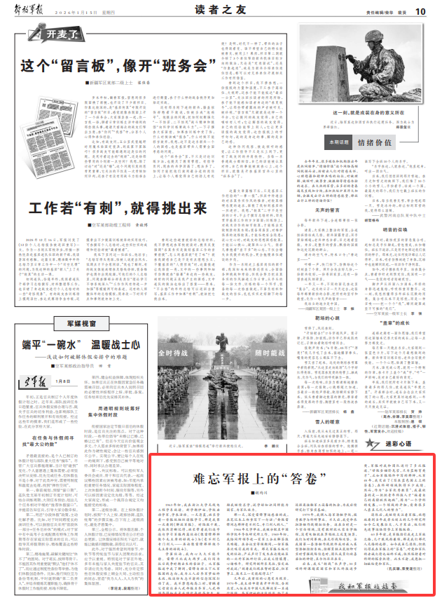 60多年前,是军报指引我走上军旅之路,几十载风雨兼程,那是我们那代人无悔的选择。如今我虽已退休,但犹记得我在军报上的“答卷”,对党和军队的赤诚之情也始终不减,依然保持着对科研的探索热情。此生不渝,我愿把一切献给党和军队。