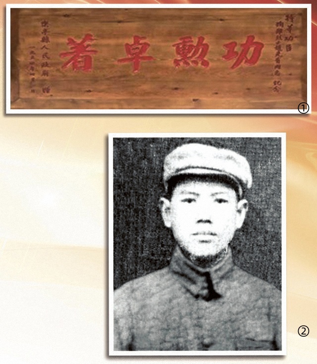 图①:赵先有烈士荣获的“功勋卓著”牌匾。
