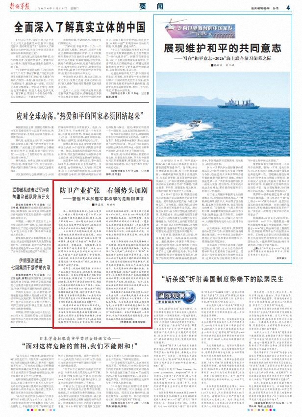 日本防卫产业快速扩张的势头,似乎正在重现第二次世界大战前夕日本穷兵黩武的情形,不禁使人担忧军国主义正在卷土重来。而日本在历史问题上的含糊态度,与在军事上的激进姿态相结合,恐将形成“否认历史—扩军备战—地缘挑衅”的危险循环。日本扩军备战的一系列举动,不仅严重挑战战后国际秩序,更会将地区局势推向危险边缘。