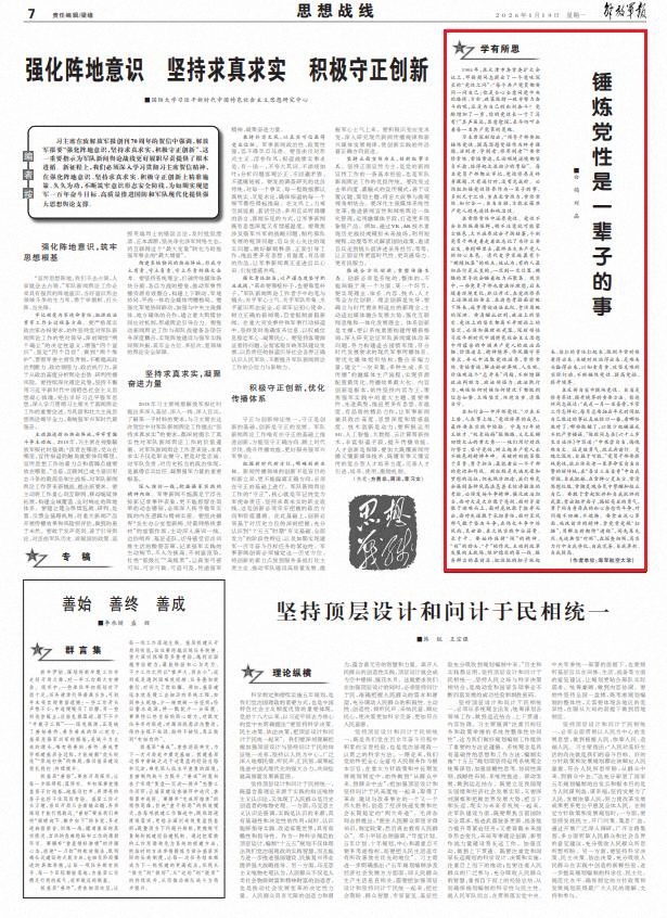 在知行合一中淬炼党性。“刀在石上磨,人在事上练。”党性修养的成色,最终要在实践中检验。守岛32年的王继才、“校长妈妈”张桂梅、义无反顾回馈大山的黄文秀……他们用行动践行誓言、坚守党性,树立起共产党人永不褪色的精神丰碑。关键时刻能否敢于负责、勇于担当,最能看出一个干部的党性和作风。新征程是充满光荣和梦想的远征,但也绝非坦途,我们难免会遇到各种风高浪急甚至惊涛骇浪的考验,必须发扬斗争精神,强化政治担当,面对大是大非敢于亮剑,面对矛盾敢于迎难而上,面对危机敢于挺身而出,面对失误敢于承担责任,面对歪风邪气敢于坚决斗争,在伟大斗争中经风雨、见世面,在火热实践中壮筋骨、长才干。要始终保持“闯”的精神、“创”的劲头、“干”的作风,主动到改革发展的主战场、维护稳定的第一线、服务群众的最前沿,把该挑的担子挑起来、该扛的责任扛起来,做到平常时候看得出来、关键时刻站得出来、危难关头豁得出来,以知重负重、攻坚克难的实际行动,不断锤炼党性、提高觉悟、提升境界。