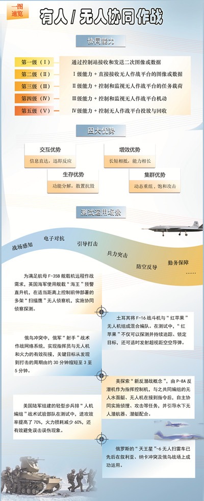 不可否认,目前的有人/无人协同作战,更多集中在战术性的力量组合运用,多指向低层级的小型作战系统或作战单元。但研究普遍认为,有人/无人协同作战编队“小联通”的建设,将极大推动联合作战体系“大融合”的形成,进而构建起适应未来智能化作战需要的组织形态。相关装备技术的升级换代,将加速军事力量向无人化转进、向智能化转型。