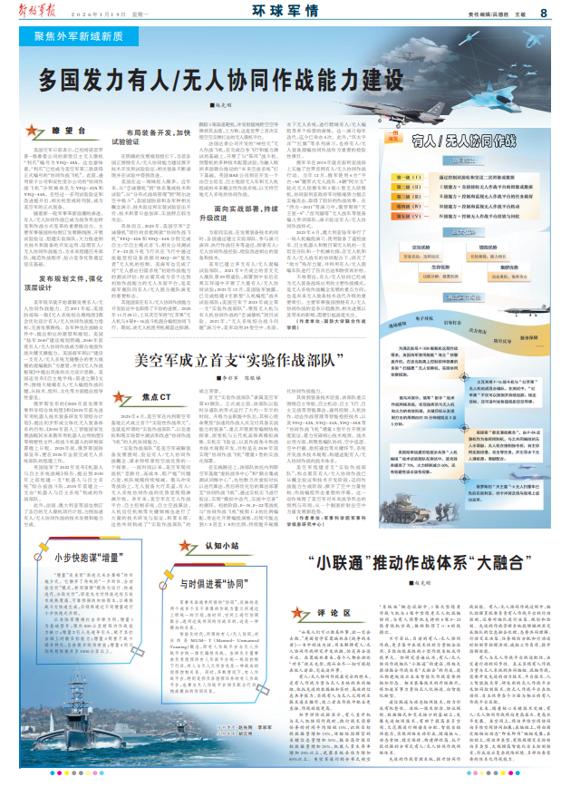 随着新一轮军事革新浪潮的演进,有人/无人协同作战已成为战争形态转变和作战方式变革的重要推动力。主要军事强国纷纷制订发展路线图、开展试验验证、组建实验部队,大力推进相关技术和装备的开发运用,培塑有人/无人协同作战能力,为未来组建任务部队、规范作战程序、抢占竞争优势奠定坚实基础。