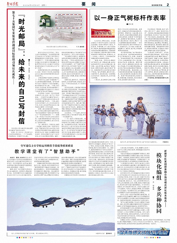 “一年一跬步,积微能成著。给未来的自己写封信,目的是提醒官兵珍惜时间、努力拼搏,向着目标全力奔跑。”该旅领导告诉笔者,“时光邮局”既是官兵个人奋斗的见证,更是该营通过目标管理引领官兵成长的生动实践,下一步,他们将对“时光邮局”活动进行优化完善,鼓励大家将个人成长与单位发展紧密结合,立足岗位为部队建设贡献更多力量。