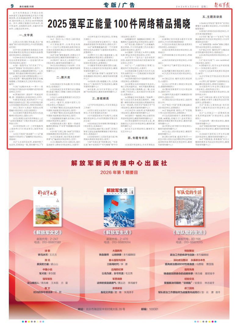 由中央军委政治工作部主办的2025强军正能量网络精品评选今天揭晓结果,经各级遴选推荐、专家集中评审、组织结果公示,共评出100件网络精品。其中,网络正能量文字类20件、图片类20件、音视频类20件、专题专栏类20件、主题活动类20件。