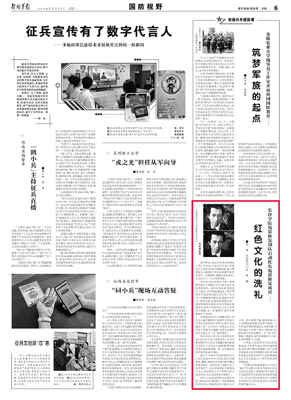 2022年,长沙学院与当地一家视频创意产业集聚区合作,联合成立电影修复团队,启动红色电影修复项目。“起初,我们希望通过这一项目帮助学生体验前沿技术的应用。”艺术设计学院副院长黄佳说,随着合作深入,学院发现,红色电影修复亦是一堂国防教育实践课,学生在修复电影画面的过程中对革命历史有了更深刻的理解,是一场难得的“绝知此事要躬行”的体验。