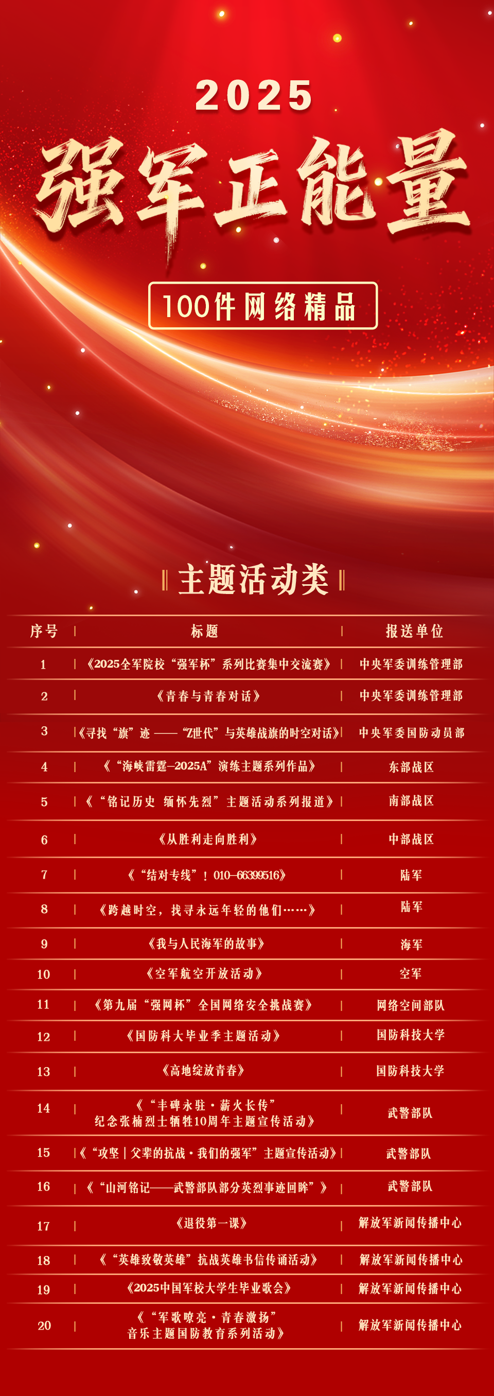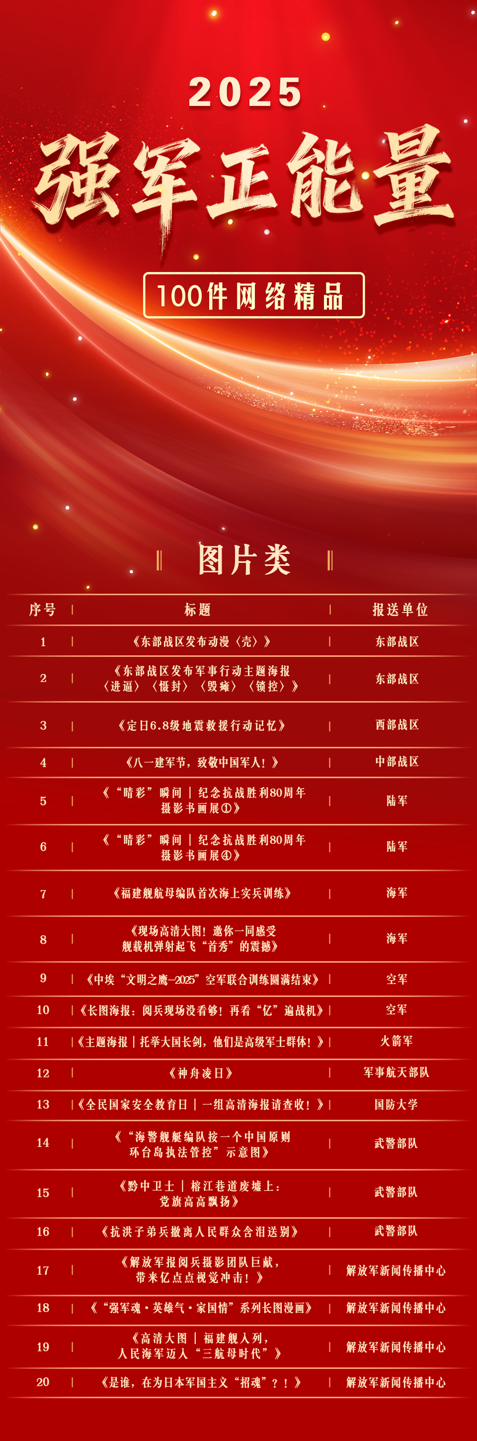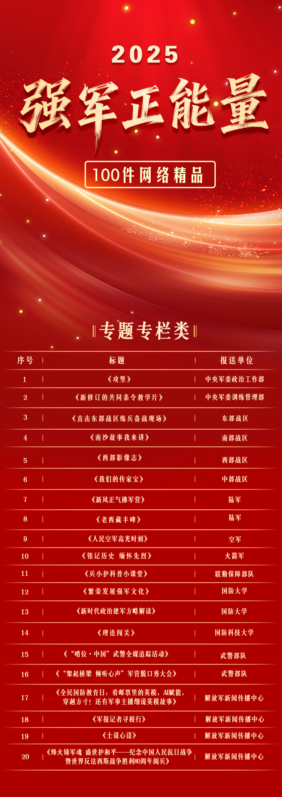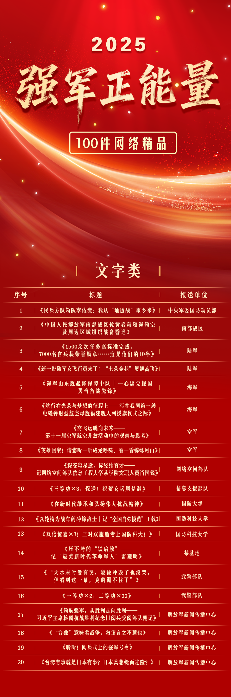 由中央军委政治工作部主办的2025强军正能量网络精品评选今天揭晓结果,经各级遴选推荐、专家集中评审、组织结果公示,共评出100件网络精品。其中,网络正能量文字类20件、图片类20件、音视频类20件、专题专栏类20件、主题活动类20件。名单如下: