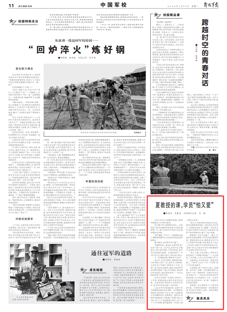 采访中,学员们都说,夏教授的课,大家“既怕又爱”!怕,是因为上他的课,大家的身子和脑子都得动个不停,太累!爱,是因为他讲的,都是从基层带回来的鲜活案例。“他让我们练的,都是我们未来战场上能打赢的本事。”一名从边防部队提干的学员说。