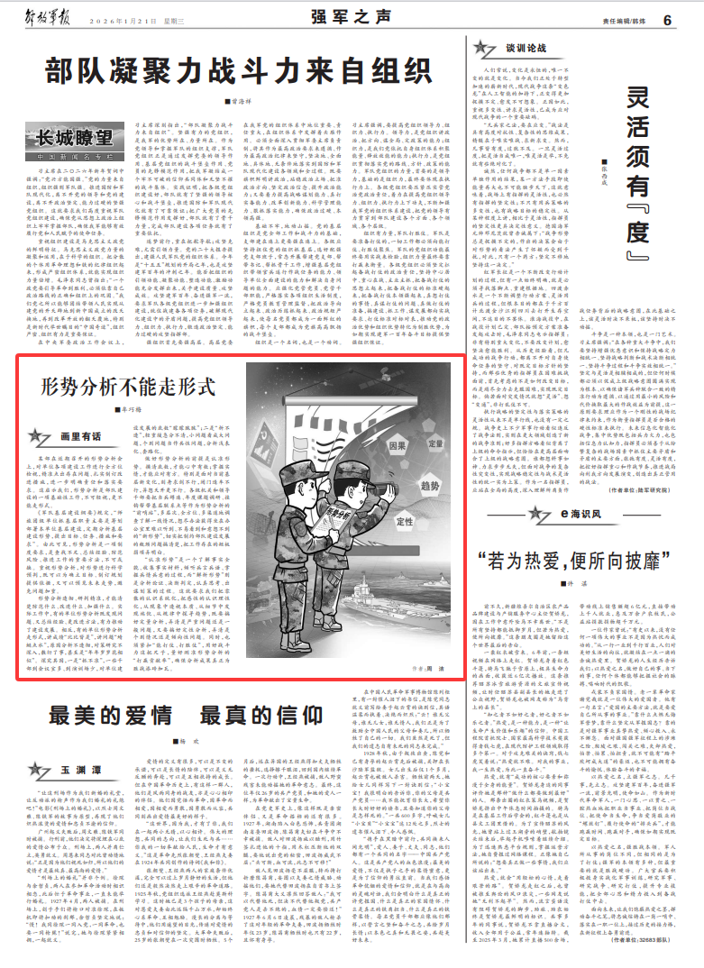 某部在近期召开的形势分析会上,对单位各项建设工作进行全方位检视,精准点出存在问题、扎实制订改进措施,进一步明确责任和落实要求。这启示我们,形势分析是部队建设的一项基础性工作,不可轻视,更不能走形式。