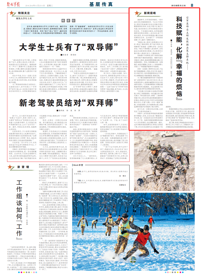 凛凛寒冬,空军某部训练场,一场实战化对抗训练刚刚结束。与以往不同的是,质控员张海通并没有在训练后埋头整理厚厚的资料,而是不慌不忙地打开电脑,登录该部自主研发的数据决策支持系统。只见他轻点鼠标,各项装备数据即刻呈现在屏幕上,还自动生成了可视化图表,其中的异常数据以醒目的颜色被标注出来。这为他们下一步的装备保障工作,提供了清晰的指引。