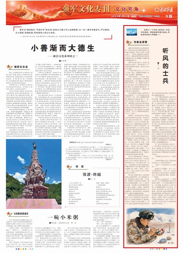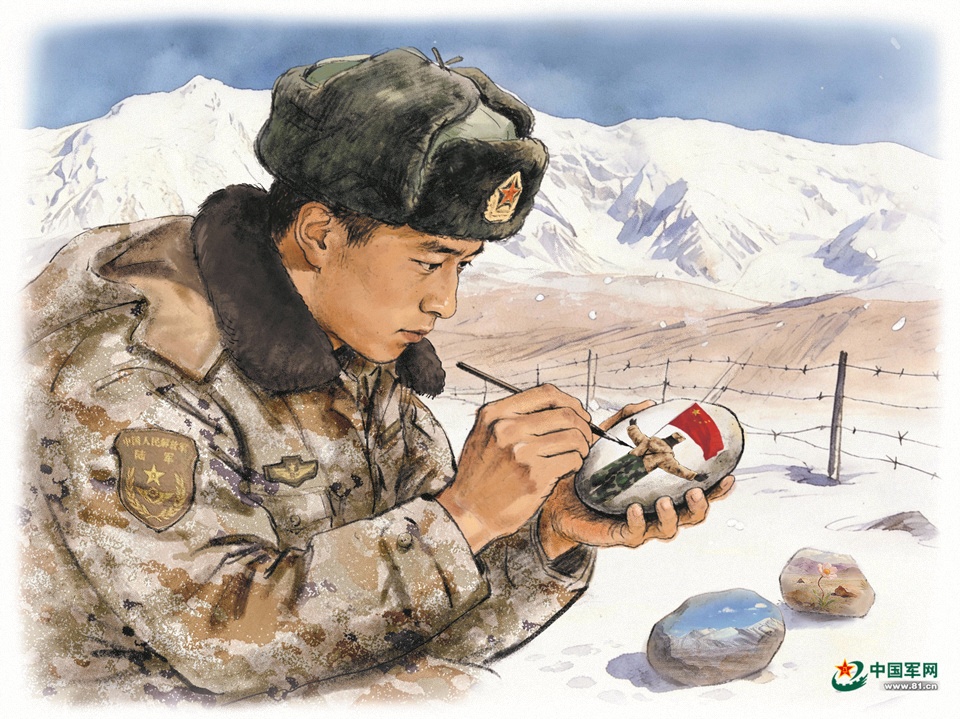 我问:“这是画的谁?”“新兵时,我掉进河里,排长在拉我。”“这是你排长?把心头的记忆,画在石头上?”他笑着点点头。“有点意思!”我一边说,一边对那些石头挨个端详起来:有整齐的队列,有先进的武器,也有巡逻路上的一株草、一簇花、一座山、一朵云。原来,这些石头记录了他们的边关生活呀!