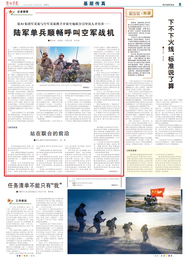 如今,我已能熟练使用空地联合通信系统,在规定时间内完成目标识别、坐标传递、任务规划与简令发送。像我这样的官兵,以后会越来越多。那道曾经横亘在军种之间的“隐形壁垒”,正被一点一点打破。何其有幸,我亲身经历并见证了这个过程,站在了联合的前沿。