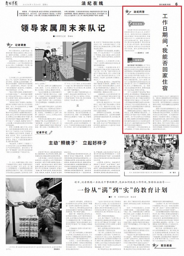 陆军某旅干部闫麒兆:关于军人回家住宿的权益,新修订的《中国人民解放军内务条令》作出调整,明确配偶或者需要本人单独照顾(抚养)的未成年子女在驻地以及驻地周边生活的,可以在休息日和节假日的前1日下午操课结束后离队,休息日和节假日结束当日晚饭前归队。此外,每周工作日个人支配的课外活动时间也可以回家住宿1次,当日下午操课结束后离队,次日上午操课前归队。这一条款为官兵处理临时性事务、照顾家庭提供了合法渠道,受到官兵欢迎。