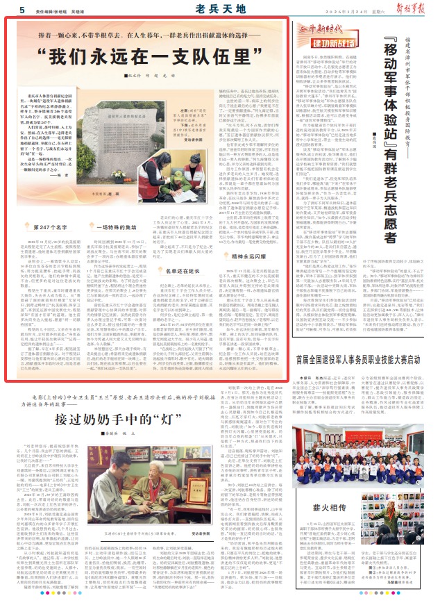 米智慧回忆,那天办理手续时,有老兵提出心愿:希望将来完成遗体捐献后,他们的名字能刻在同一块碑上。老兵们说,现在战友常相聚,以后也要在一起,“我们永远在一支队伍里”。