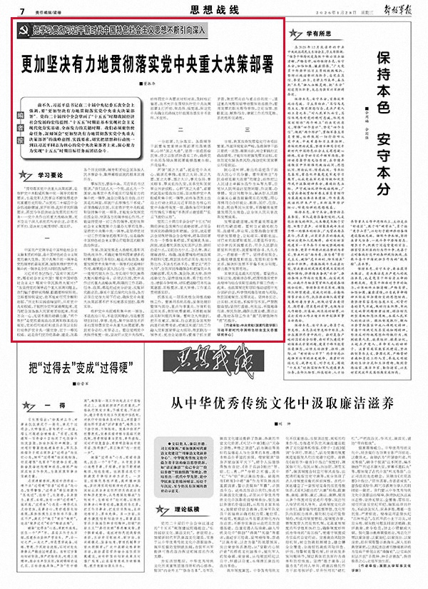 前不久,习近平总书记在二十届中央纪委五次全会上强调,要“更加坚决有力地贯彻落实党中央重大决策部署”。党的二十届四中全会擘画了“十五五”时期我国经济社会发展的宏伟蓝图。“十五五”时期是基本实现社会主义现代化夯实基础、全面发力的关键时期。我们必须聚焦使命任务,深刻领会“更加坚决有力地贯彻落实党中央重大决策部署”的战略意图、实践要求,切实把思想和行动统一到以习近平同志为核心的党中央决策部署上来,凝心聚力为实现“十五五”时期目标任务而团结奋斗。
