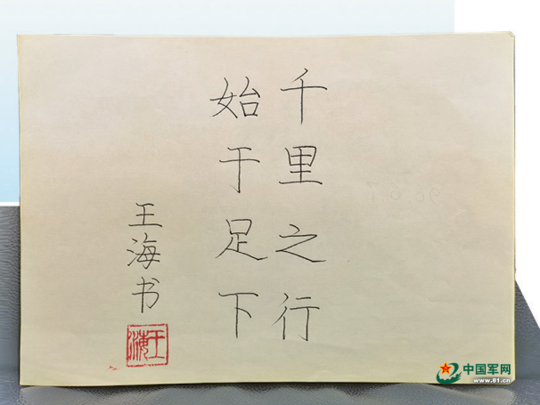 此次王小华和家人捐赠给中国航空博物馆的实物中,有一张王海书写“千里之行,始于足下”字样的手稿。1996年,离开领导岗位的王海,用楷书工工整整写下这8个字,自勉无论是革命生涯还是人生道路,都需要脚踏实地、一步一个脚印向前走。