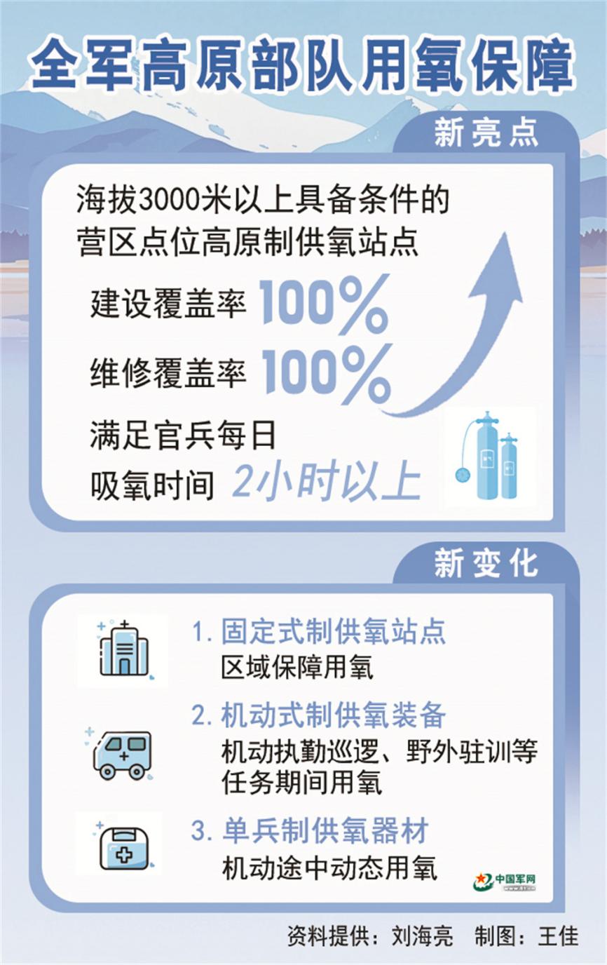 据介绍,近年来,中央军委后勤保障部有关部门坚持体系抓建、全维覆盖、高效保障,持续完善制供氧保障配套规定和建设标准,制定实施《高原部队官兵吸氧标准》,稳步推进制供氧站点和器材建设,常态组织制供氧设备器材维修服务,先后在不同海拔地区设立研究基地和实验室,支持开展制供氧技术和产品创新研究。