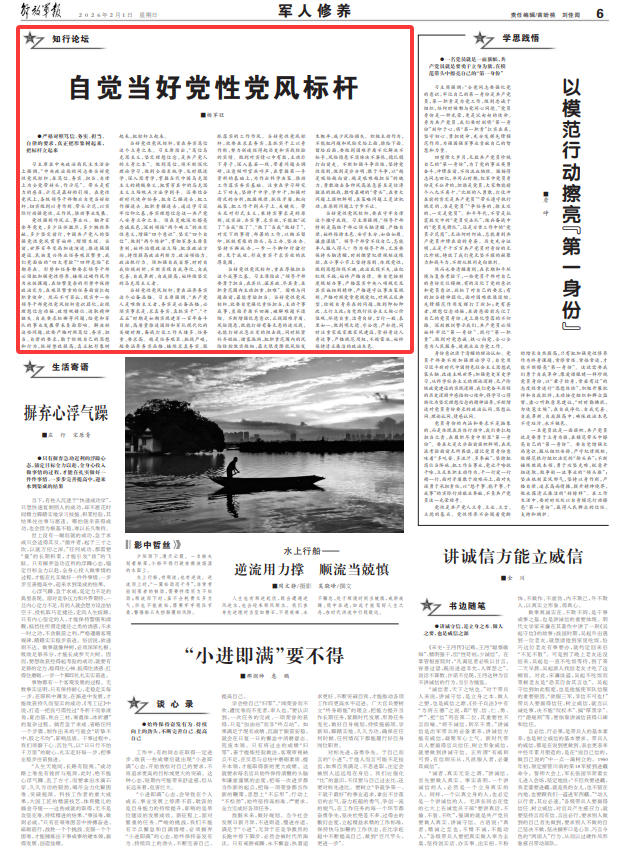 当好党性党风标杆,首在夯实笃信这个立身之本。习主席指出,“笃信马克思主义,坚定理想信念,是共产党人的立身之本”。做到笃信,须不断深化理论学习,做到全面系统学、及时跟进学、深入思考学,掌握当代中国马克思主义的精髓要义,把贯穿其中的马克思主义立场观点方法学到手。还要结合新时代使命任务,把自己摆进去、把工作摆进去、把职责摆进去,通过学习筑牢信仰之基,夯实理想信念这一共产党人安身立命之本。须在灵魂深处擦亮忠诚底色,深刻领悟“两个确立”的决定性意义,增强“四个意识”、坚定“四个自信”、做到“两个维护”,贯彻军委主席负责制,始终站稳政治立场、把准政治方向,持续提高政治判断力、政治领悟力、政治执行力。须加强自我省察,时时自我检视剖析,不断实现自我净化、自我完善、自我革新、自我提高,始终做坚定的马克思主义者。
