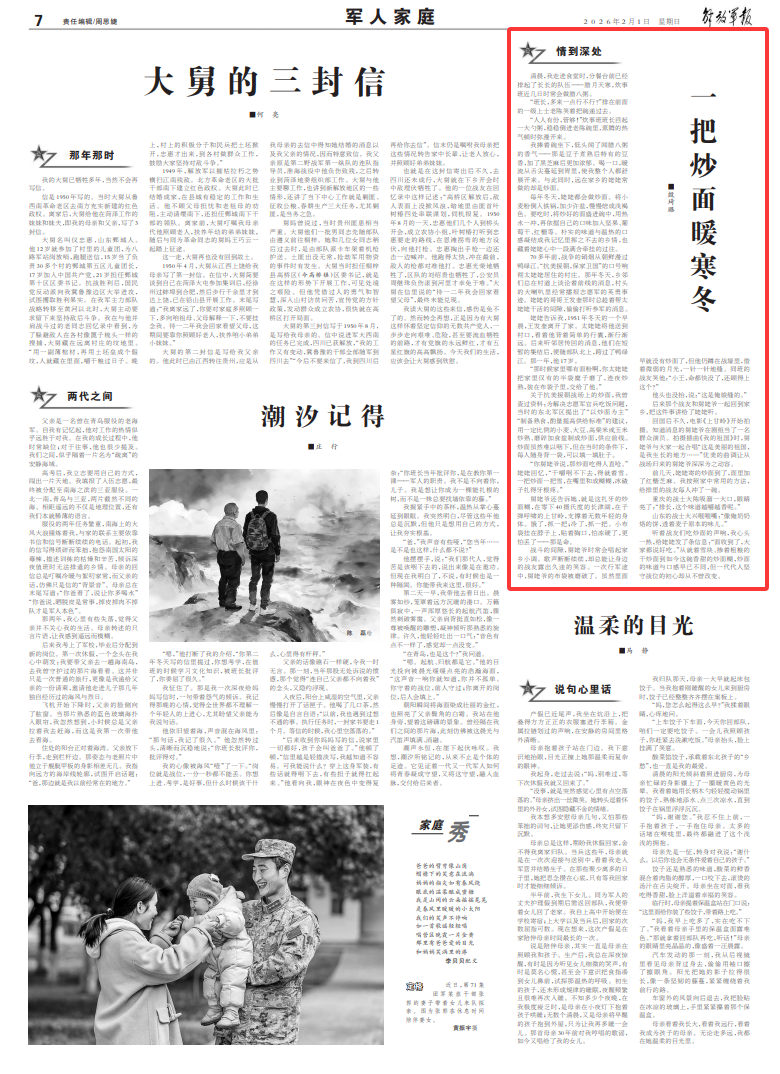 听着战友们吃炒面的声响,我心头一热,给姥姥发了条信息:“面收到了,大家都说好吃。”从就着雪块、掺着粗粮的干炒面到如今这碗香甜的炒面糊,炒面的味道与口感早已不同,但一代代人坚守战位的初心却从不曾改变。