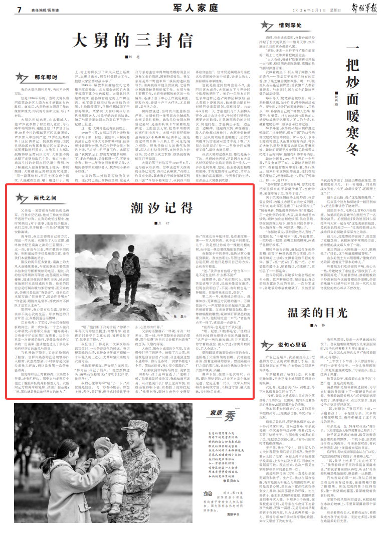 入夜后,阳台上咸湿的空气里,父亲慢慢打开了话匣子。他喝了几口茶,然后像是自言自语:“以前,我也遇到过想不通的事。执行任务时,一封家书要走1个月。等信的时候,我心里空落落的。”