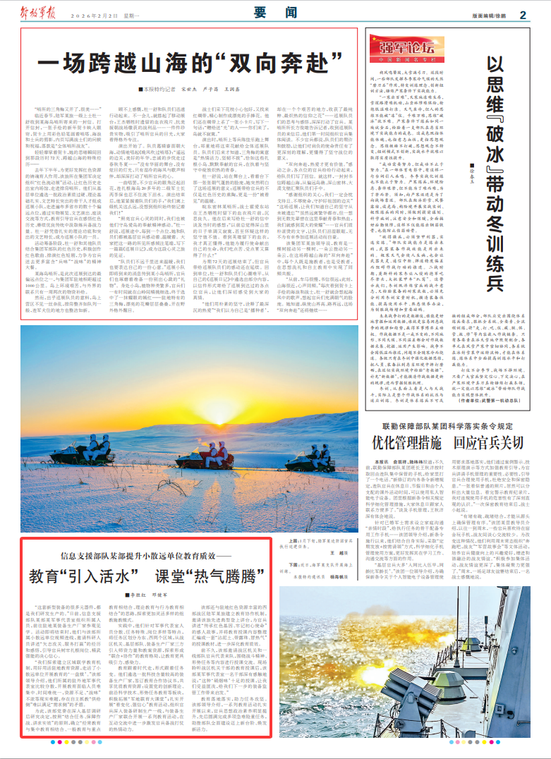 教育落地落实,助力任务攻坚。该部领导介绍,一系列教育活动扎实开展以来,官兵思想政治素养明显提升,先后圆满完成多项急难险重任务,助推部队全面建设迈上新台阶、焕发新活力。