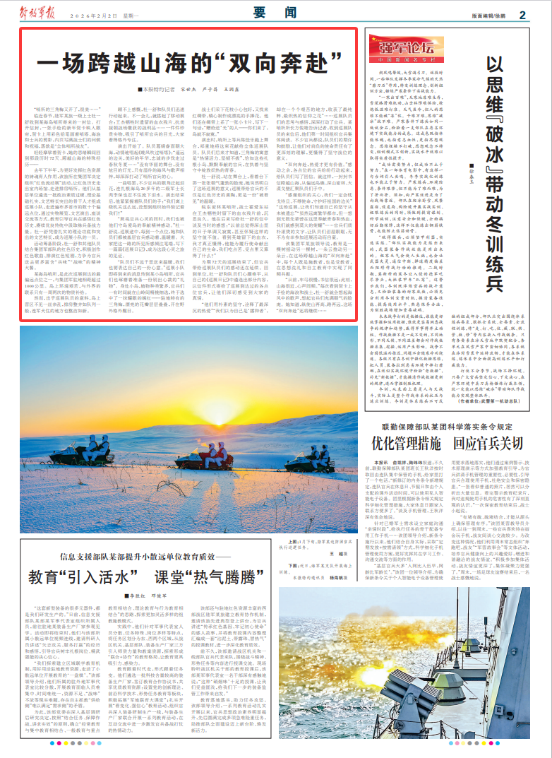 该集团军某旅领导说,教育是一棵树摇动另一棵树,一朵云推动另一朵云,在这场跨越山海的“双向奔赴”中,每个人既是施教者,也是受教者,在思想洗礼和自主教育中实现了同频共振。