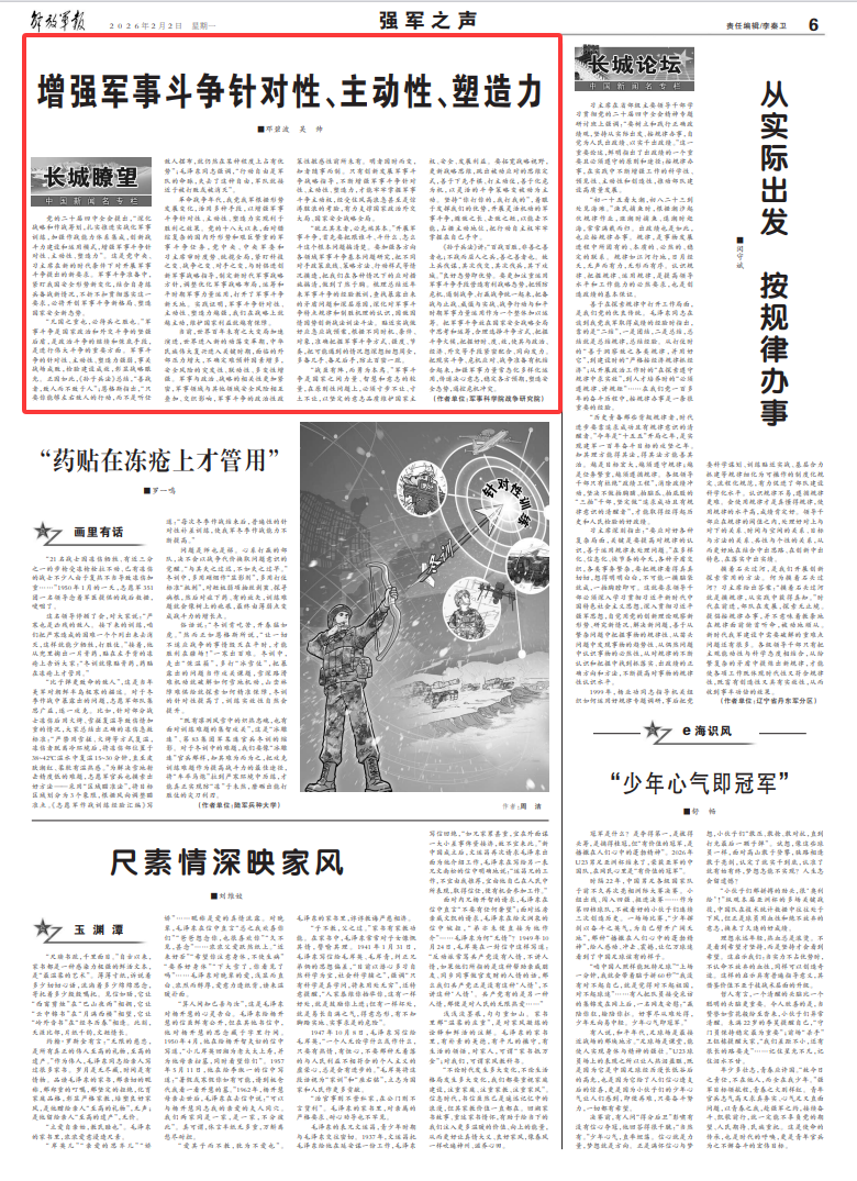 党的二十届四中全会提出,“深化战略和作战筹划,扎实推进实战化军事训练,加强作战能力体系集成,创新战斗力建设和运用模式,增强军事斗争针对性、主动性、塑造力”。这是党中央、习主席在新的时代条件下对开展军事斗争提出的新要求。军事斗争准备中,紧盯我国安全形势新变化,结合自身练兵备战新情况,不折不扣贯彻落实这一要求,必将开创军事斗争新格局、塑造国家安全新态势。