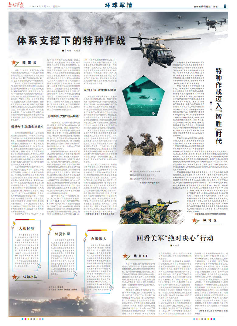 事实上,从美军击杀伊朗革命卫队“圣城旅”指挥官苏莱曼尼的行动,到以色列针对伊朗核计划和报复能力发起的“崛起雄狮”行动,再到乌克兰的“蛛网”行动和美军此次发起的“绝对决心”行动,高风险、高收益的特种作战,已经成为位于“战争工具箱”上层的重要选项,受到越来越多决策者的偏爱。随着无人智能技术的发展,特种作战正朝着精准化、智能化、无人化、全域化的趋势迈进,“体系支撑、精兵制胜”的特点也愈加鲜明。作为“体系尖刀”,特种作战力量行动的成功更加依赖于全域作战体系的情报、指挥、火力、保障等资源的有机融合。