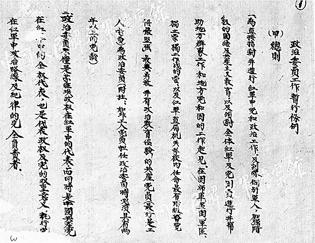 1938年初,在此背景下诞生的《国民革命军第十八集团军政治工作暂行条例(草案)》(以下简称《条例》),开宗明义地宣告:“抗日战争是一种民族自卫的革命战争,政治工作是这一民族抗战军队的‘生命线’!”