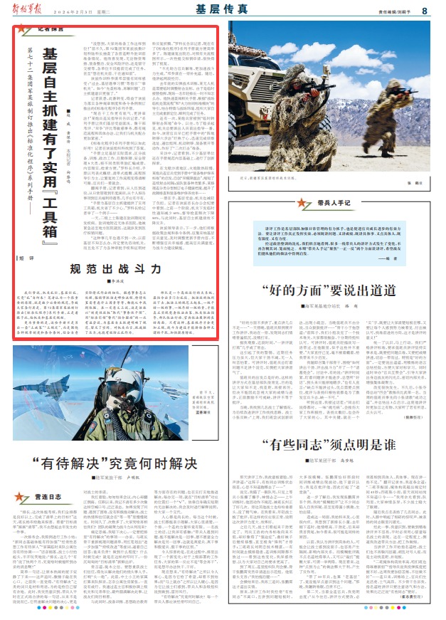 “现在干工作更有底气、更讲章法!”某炮兵连吴指导员告诉记者,“系列手册让我们基层受益匪浅。像干部考评、‘双争’评比等敏感事务,都有规范流程和具体办法,让我们与机关配合更加紧密。”