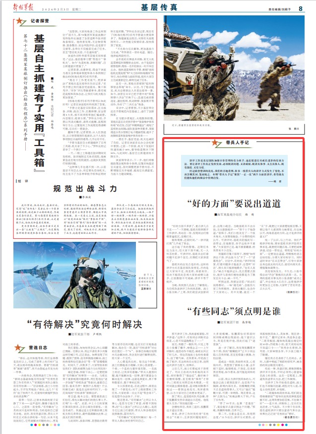 经过政治整训的洗礼,我们欣喜地看到,很多一线带兵人的讲评方式发生了变化,不再含糊其词、笼而统之。本期“带兵人手记”聚焦“一正一反”两个方面谈讲评,希望战友们能从他们的做法中得到启发。